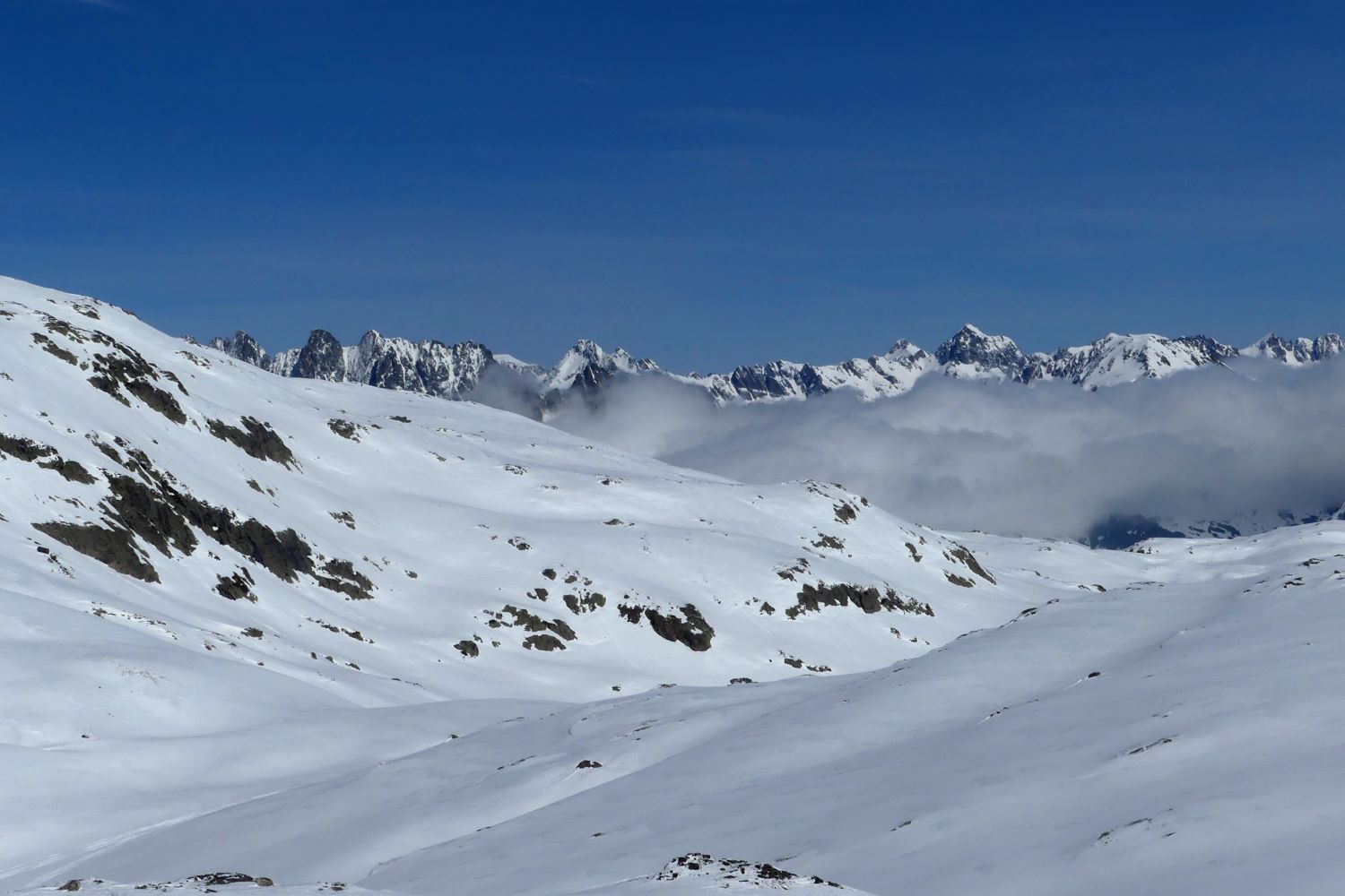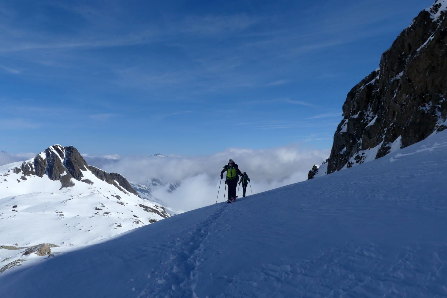 On laisse les skieurs partir sur le versant Ouest du vallon en direction de l’aiguille de la Laisse, l’Aiguille Noire, ou le Dôme de la Cochette. Nous, nous remontons par le versant Est en direction des Rochers du Genépi. Nous sommes seuls au milieu du moutonnement des reliefs blancs.