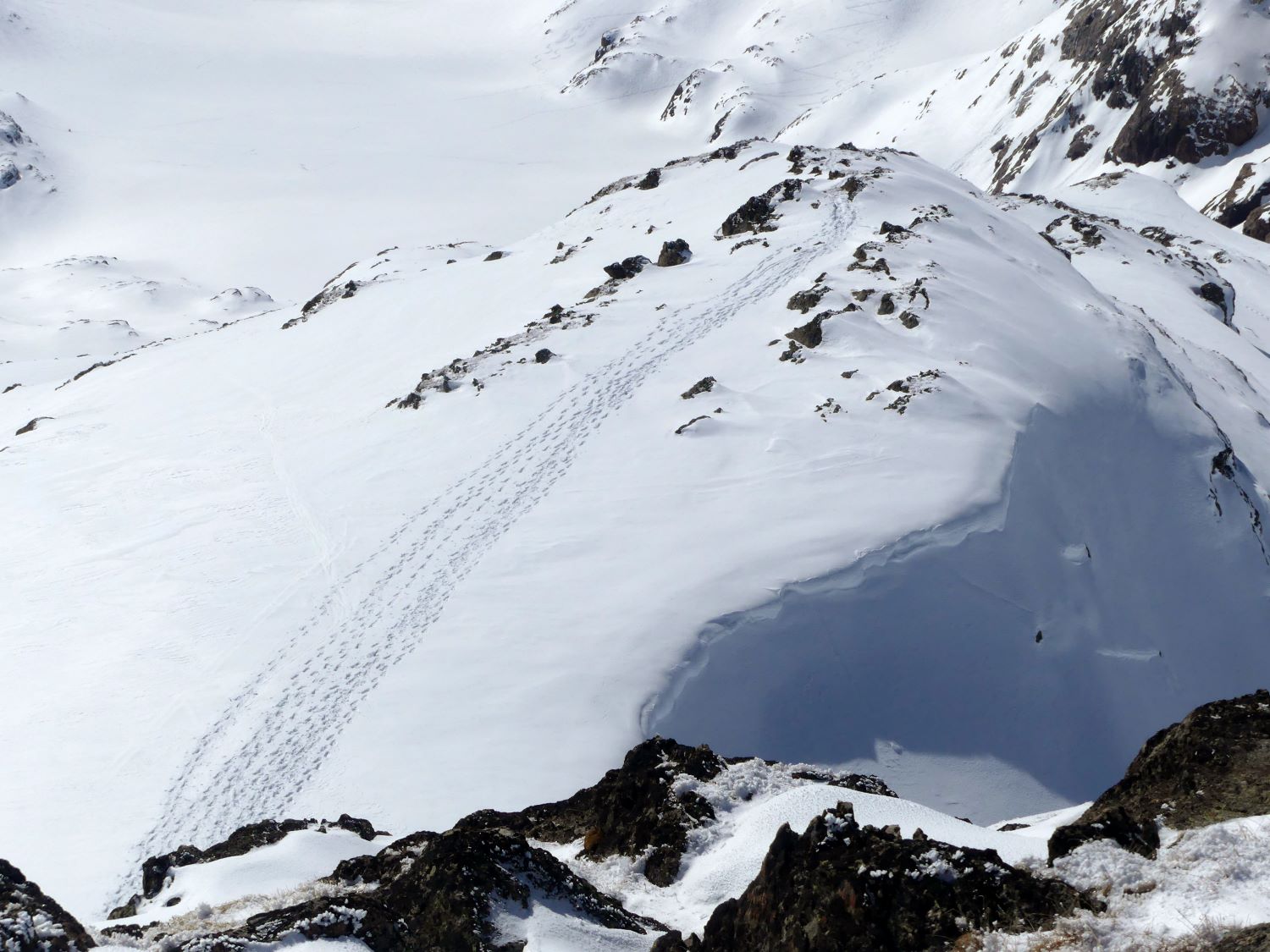 Il faut quand même songer à redescendre. Nous rejoignons la crète du Genépi avant d’entamer une longue descente vers le Mollard (2 324m). La neige est bonne et quelques pentes incitent certains à tenter la descente en glissade sur les fesses… pas évident de trouver la bonne position pour prendre un peu de vitesse.
