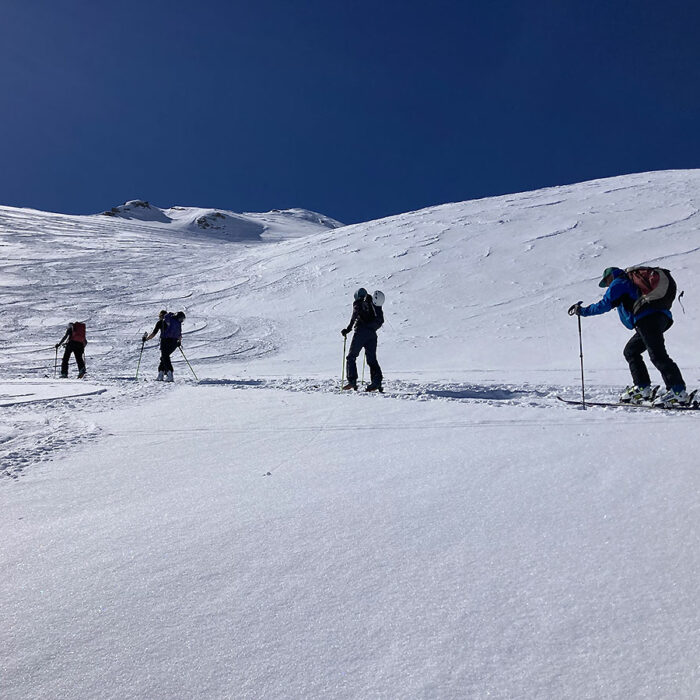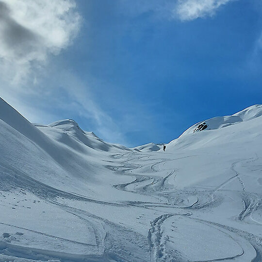 Elle pourra être très différente dans la même journée selon que le versant est exposé au nord ou au sud, ou en fonction de l’altitude. Il faut savoir jouer avec le relief naturel et ces conditions de neige changeantes pour rendre la trace la plus agréable et la plus sûre possible.