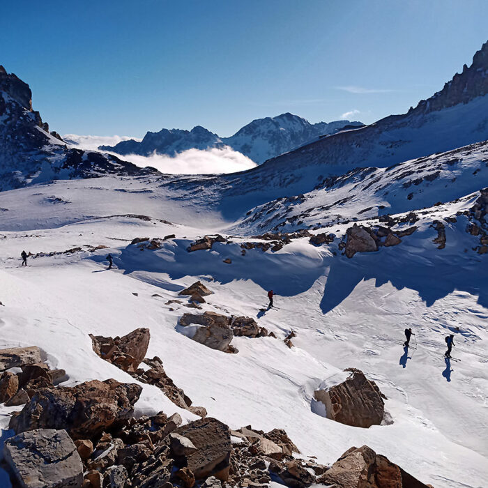 - En terrain glaciaire, baudrier, mousquetons avec broche à glace et autobloquant, et une longe sont obligatoires.